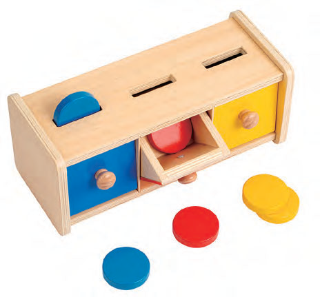 『木製コイン落とし』は、“いないいないばあ”のような遊びを通して、物が見えなくても存在していることや、自分の行動が結果につながることを自然と学べる教具です。